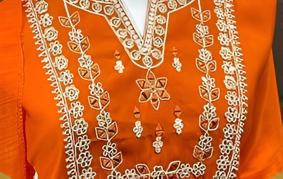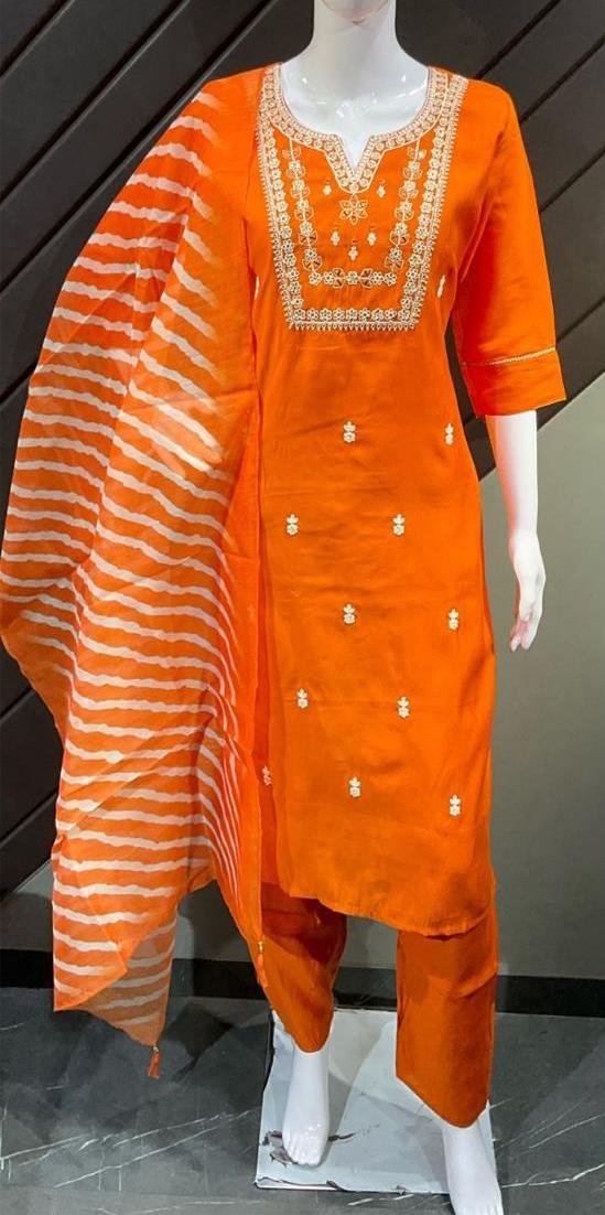 This elegant orange outfit is tailored in luxurious Roman Silk, offering a rich finish with a smooth, flowing texture. The fabric enhances the vibrancy of the orange hue while ensuring breathable comfort and graceful drape for all-day elegance.