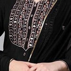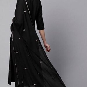 This elegant black outfit is tailored in a premium poly rayon blend, offering a lightweight, smooth texture and graceful drape. The fabric enhances the richness of the color while providing breathable comfort for all-day wear.